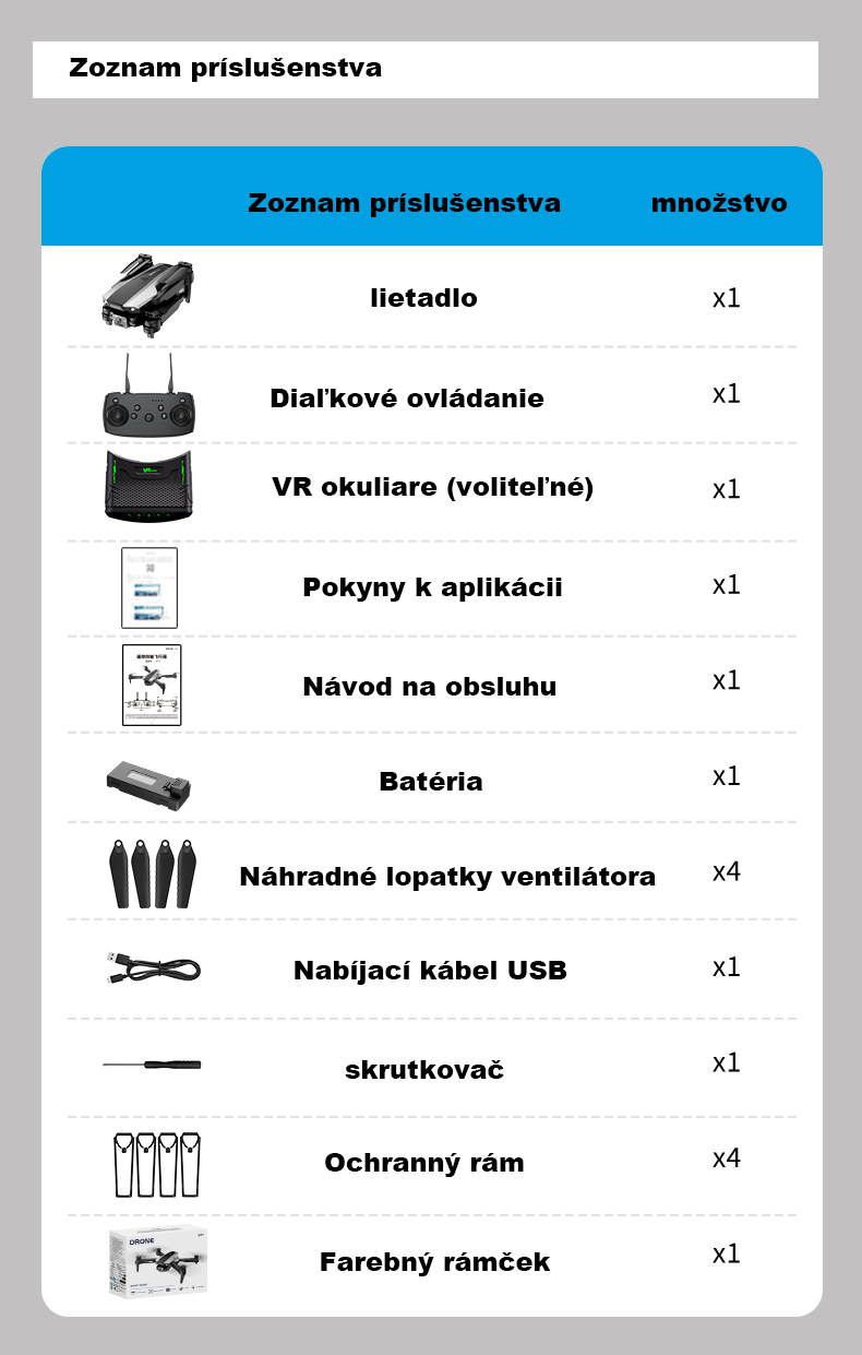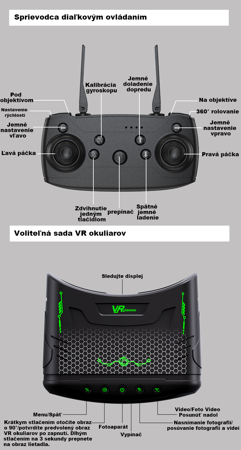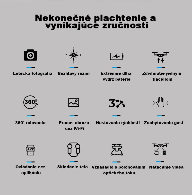 Nastaviteľná kamera, vzlet a pristátie jedným tlačidlom, 360° otočenie, režim bezhlavého nosenia, ultra dlhá výdrž batérie, prenos obrazu cez Wi-Fi, optická stabilizácia toku a vznášanie, skladacie telo pre jednoduchú prenosnosť