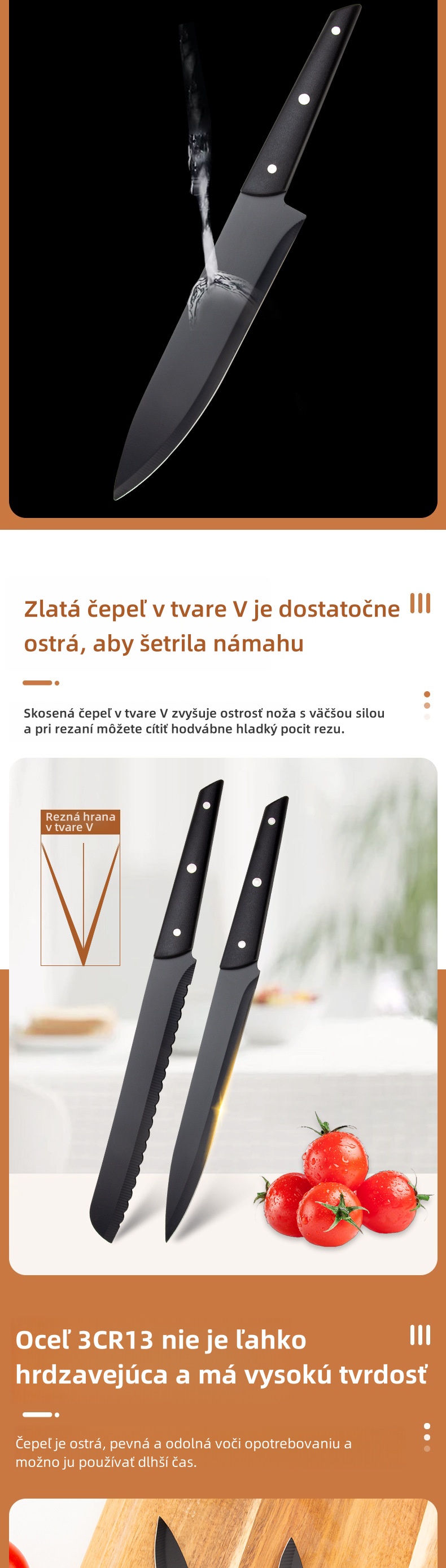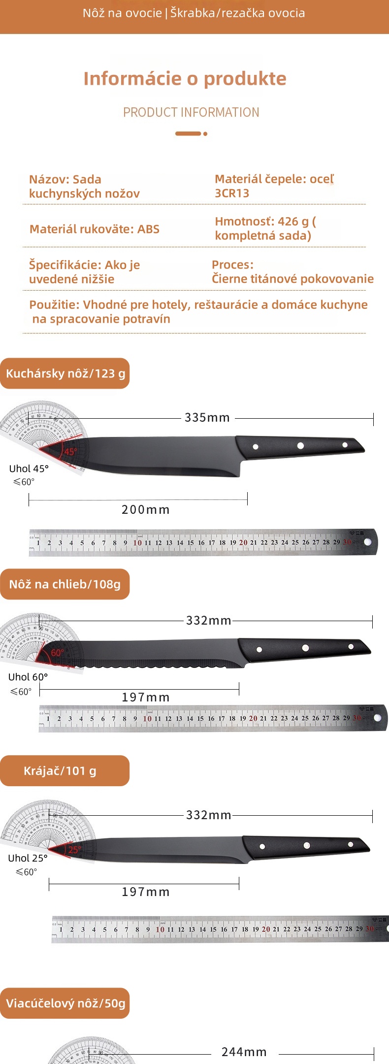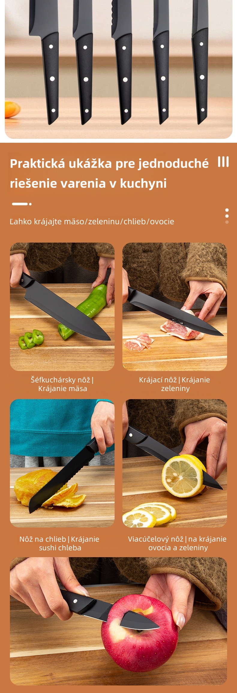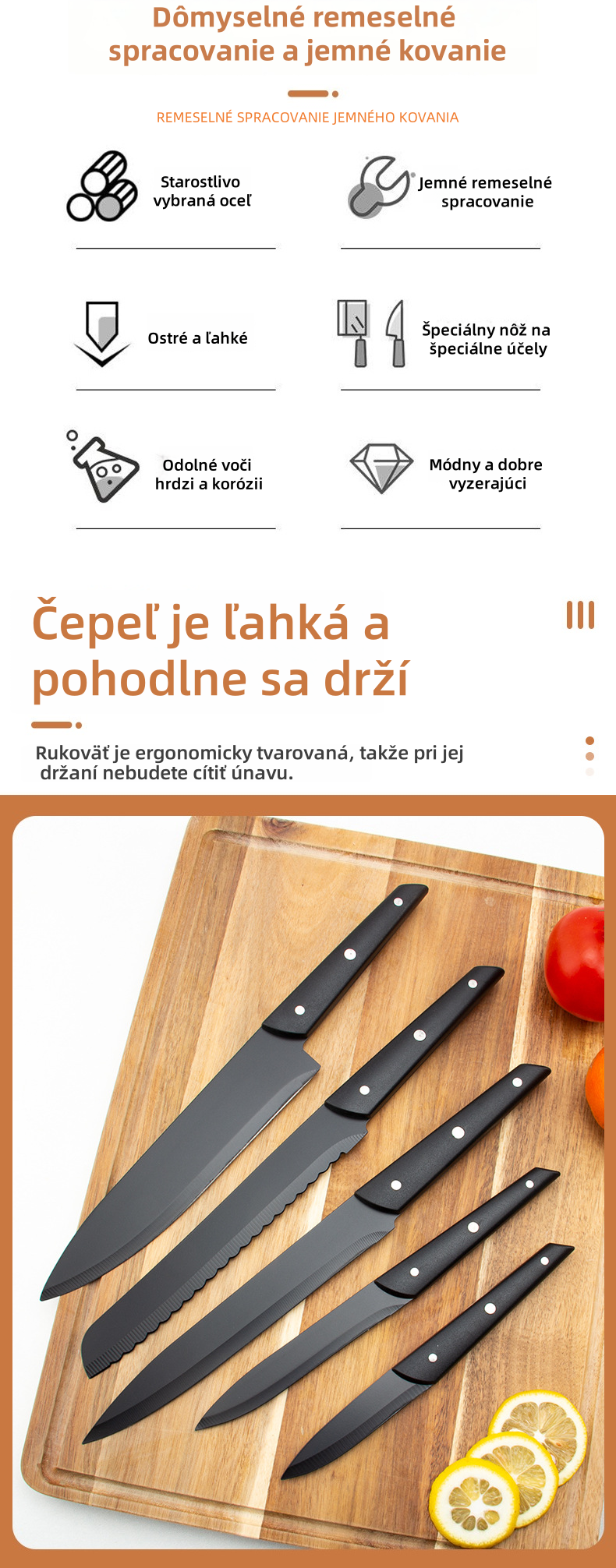 - Nôž na ovocie: Zdokonalená čepeľ sa zameriava na detaily, ľahko šúpe ovocie počas prípravy a tanierovania.