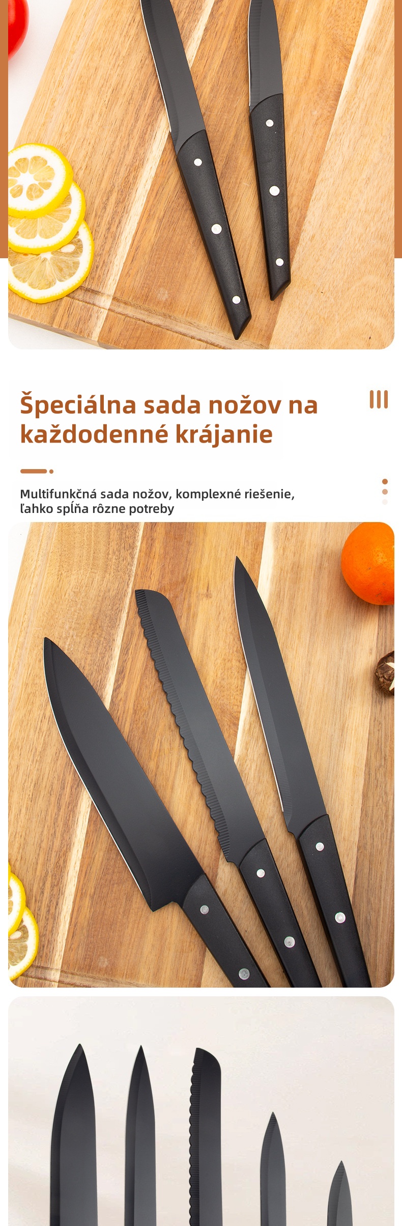 - Viacúčelový nôž: Kompaktný a flexibilný, ideálny na manipuláciu s ovocím a malými ingredienciami vrátane krájania a šúpania.