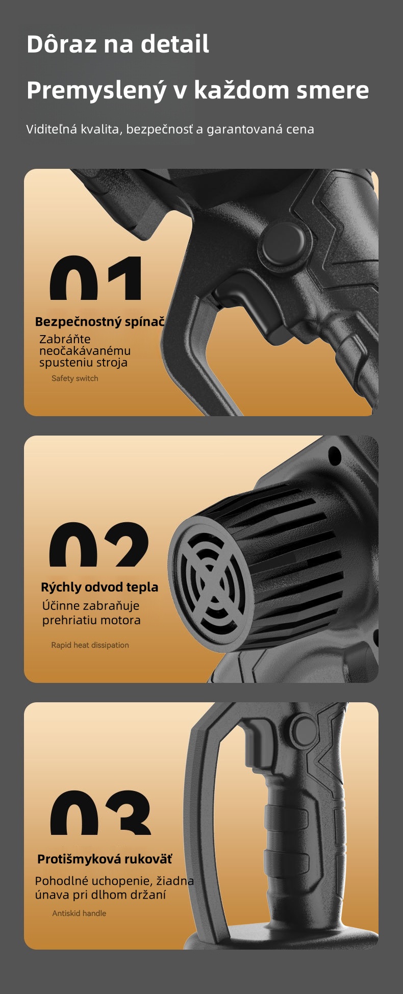 - Dvojitá bezpečnosť: Spínač ochrany proti falošnému dotyku zabraňuje náhodnej aktivácii, čím zaisťuje pokoj v duši aj pre začiatočníkov.