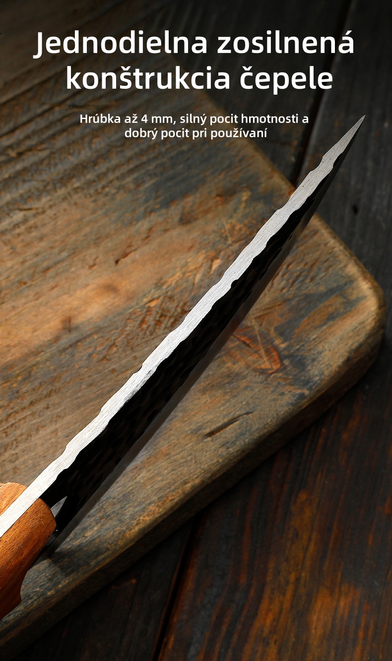 Čepeľ je vykuvaná z jedného kusu, čo zaisťuje pevnú a odolnú konštrukciu. S hrúbkou 4 mm sa v ruke cíti pevná a silná a ponúka pevný a vyvážený pocit pre hladké sekanie kostí a mäsa.